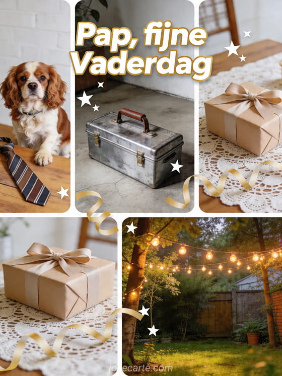 Vier papa met een realistische en vrolijke collagekaart, met een Cavalier King Charles hond naast een stropdas, een gereedschapskist, een cadeau en een zonnige tuinhoek met warme lichtjes. Een persoonlijke groet voor Vaderdag. Bekijk ook vaderdagkaart overhemd, een originele Vaderdagkaart of kaarten voor vaderdag.