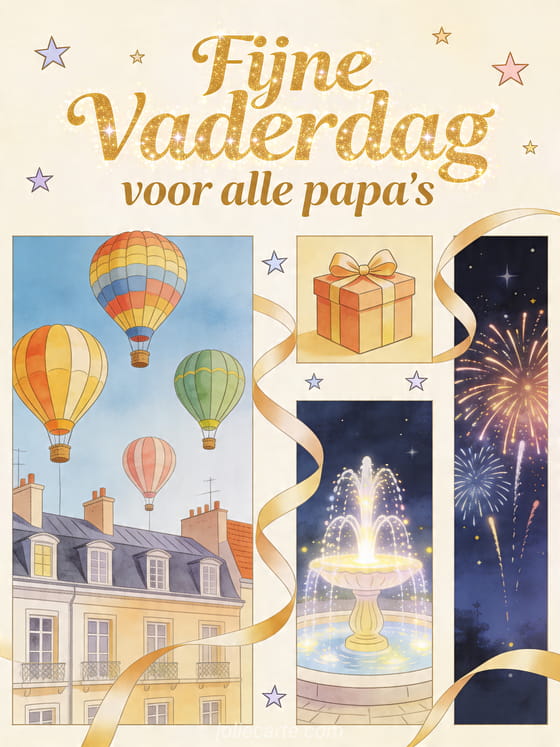 Vier alle papa's met een gedetailleerde geïllustreerde kaart met kleurrijke luchtballonnen boven daken, een cadeau, een heldere fontein en een nachthemel met vuurwerk. Dit genereuze, feestelijke ontwerp is gemaakt om breed te delen. Bekijk ook vaderdag ik mis je, een fijne vaderdagkaart of een sjabloon voor Vaderdagkaart.