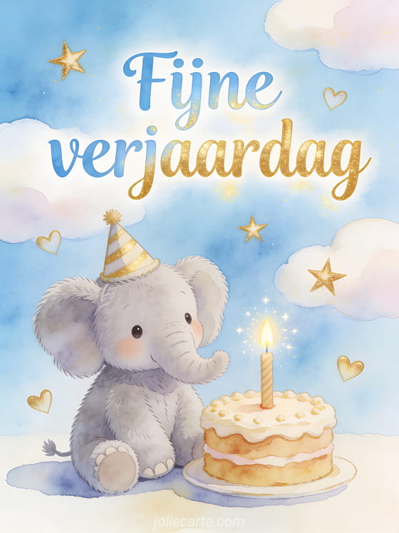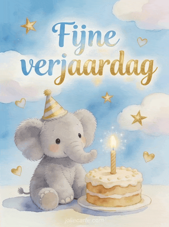 Deel een fijne verjaardag baby gif kaart met een schattige knuffelolifant, een fonkelend kaarsje en zachte pastelkleuren vol warmte. Ontdek ook fijne verjaardagskaart baby, grappig verjaardagsbericht kind en gratis geanimeerde verjaardagskaart kind.