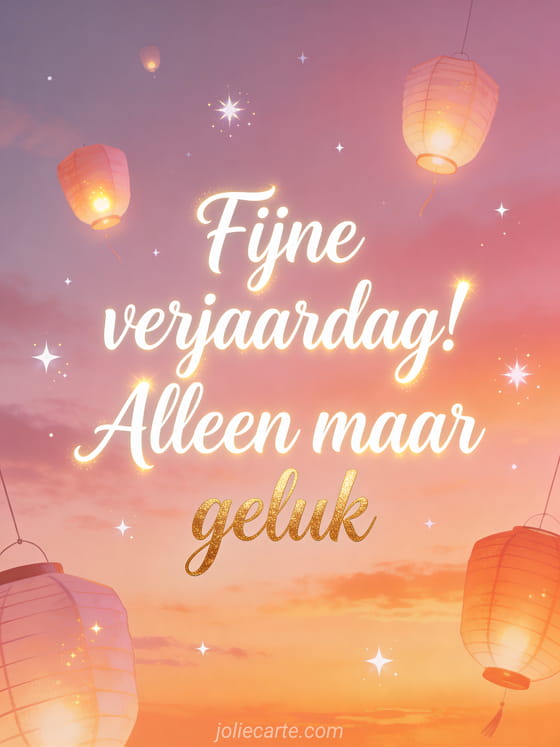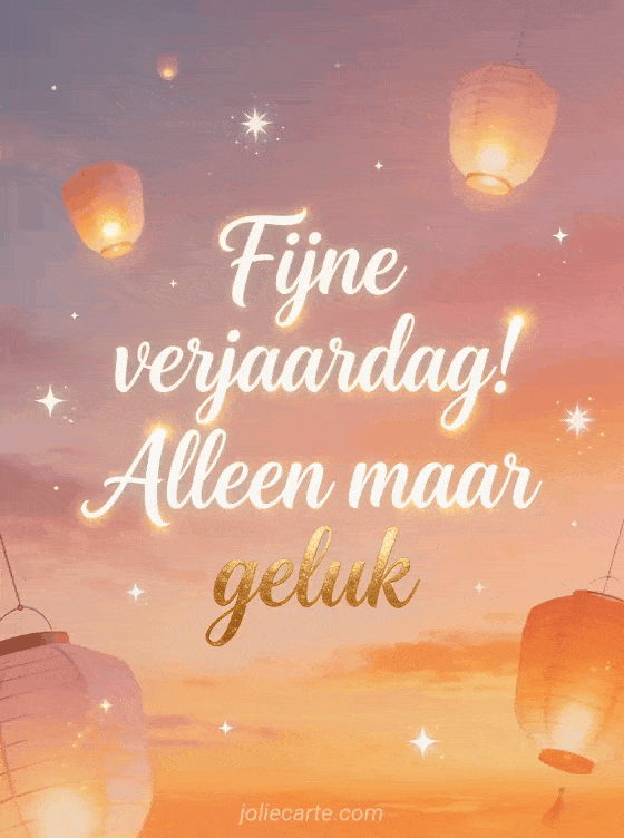 Stuur een emotioneel verjaardagsbericht in een poëtische schemerscène met zwevende lantaarns en schitterende sterren. Bekijk ook fijne verjaardag gif, bloemenboeket fijne verjaardag en een fijne verjaardag.