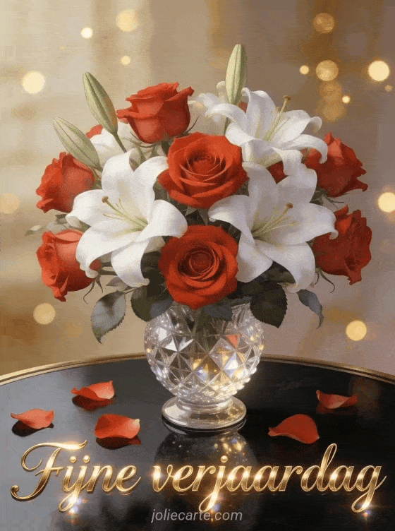 Stuur een elegante fijne verjaardag gif met rode rozen en witte lelies in een kristallen vaas vol gouden bokeh. Bekijk ook een gratis afbeeldingen fijne verjaardag of een fijne verjaardag kaart gefeliciteerd.