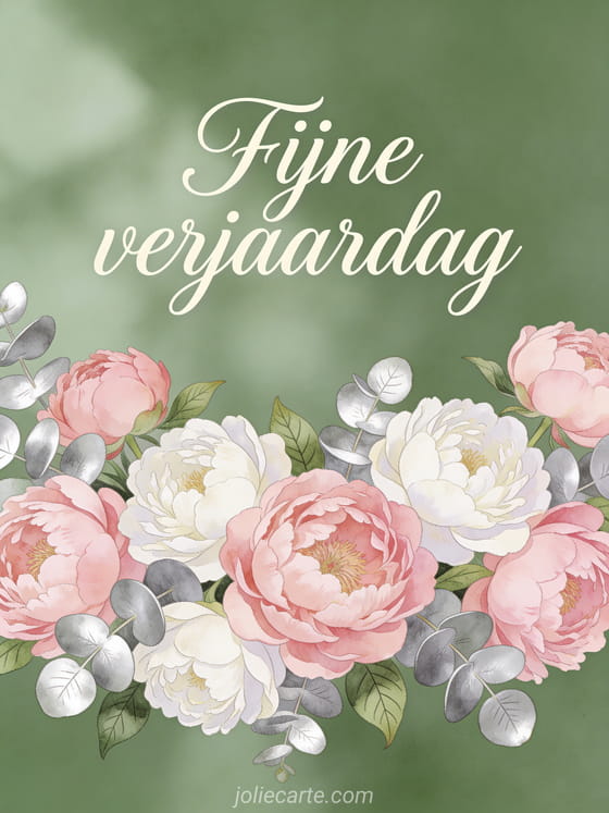 Stuur een tedere elegante verjaardagsgroet met een weelderige bloemenccompositie van roze en witte pioenrozen met eucalyptusbladeren in zacht natuurlijk licht. Bekijk ook een fijne verjaardag gif.