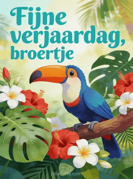 Vier je broertje met een kleurrijke toekan op een tropische tak, omringd door rode hibiscus, witte frangipani en reusachtige monsterabladeren. Je kunt ook een verjaardag mijn broer, een fijne verjaardag mijn broer gif of een kleine broer fijne verjaardag mijn broer gif kaart delen.