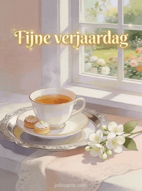 Stuur een warme elegante verjaardagsgroet met een stomend porseleinen theekopje, kleine versierde taartjes op een zilveren plateau en jasmijnbloemen. Uitzicht op een bloemrijke tuin. Bekijk ook verjaardagskaart gif geanimeerd gratis of gratis geanimeerde afbeeldingen fijne verjaardag.