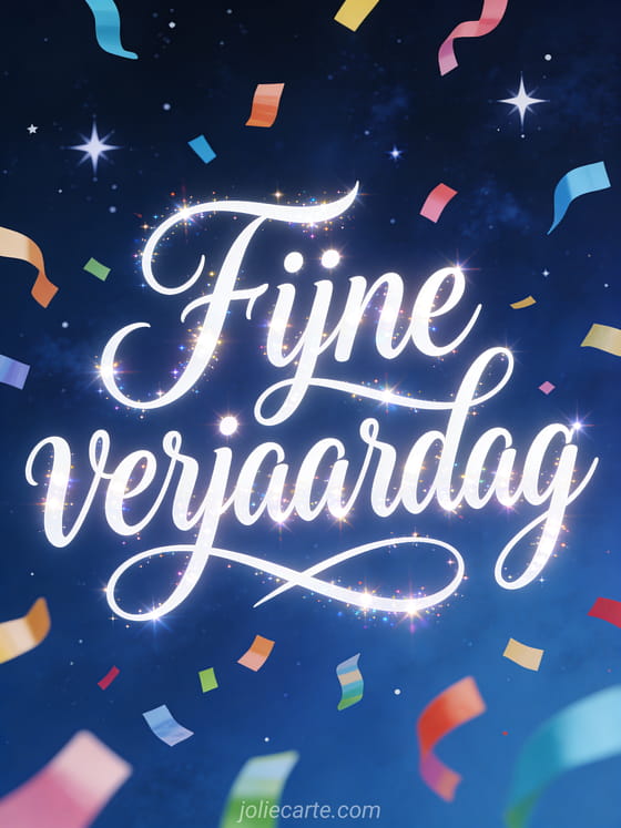 Stuur een feestelijke vrolijke verjaardagsgroet met kleurrijke confetti die zachtjes valt op een nachtblauwe sterrenhemel. Een glinsterende kaart voor elke verjaardag.