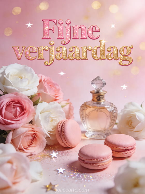 Breng glamour in het feest met deze chique verjaardagskaart met rozen, macarons en een vintage parfumflesje. Bekijk ook muzikale fijne verjaardag, fijne verjaardag dinosaurus of fijne verjaardag lieve vriendin.