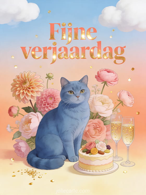 Stuur een verfijnde fijne verjaardag kaart voor je dochter met dahlia's, ranonkels en een elegante Russisch blauwe kat. Bekijk ook een gefeliciteerd kaart meisje eenhoorn of een geanimeerde kaart verjaardag voor mijn dochter.