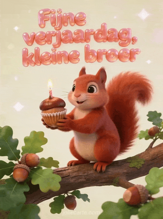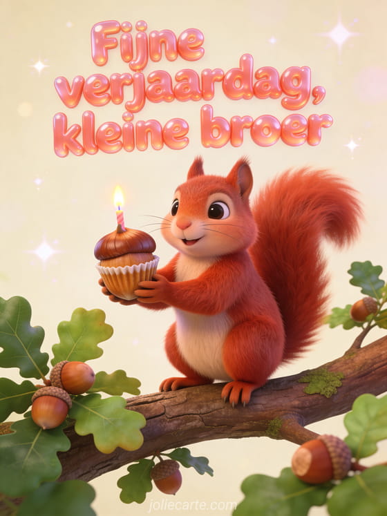 Stuur een speelse verjaardagskaart met een rode eekhoorn die een hazelnoot vasthoudt die als mini-cupcake is versierd, zittend op een eikentak. Je kunt ook een verjaardag kleine broer, een verjaardag broer of een fijne verjaardag mijn grote broer kaart delen.