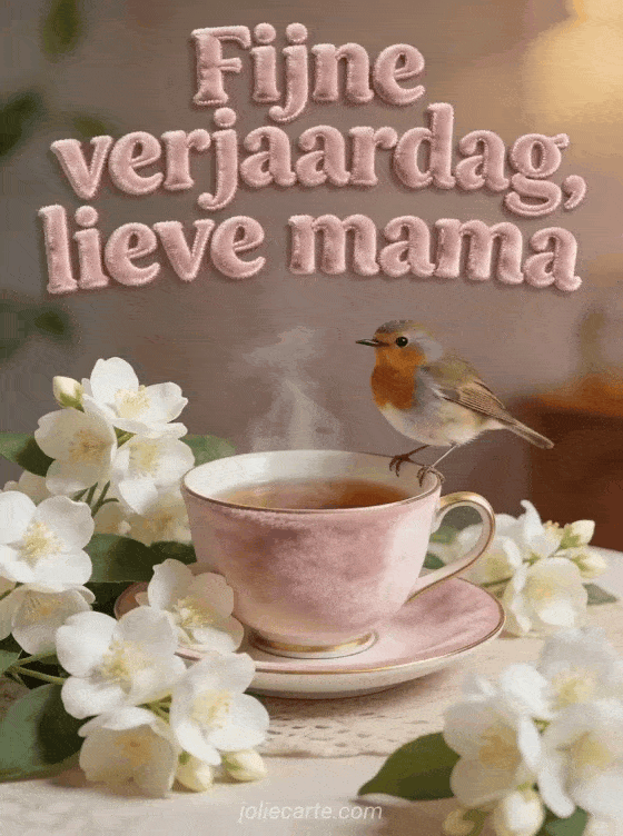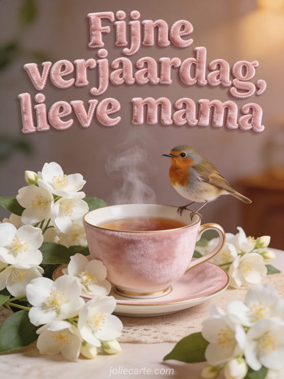 Deel een zachte verjaardagsgroet voor je lieve mama met poederroze letters, een roodborstje op een dampend kopje thee, jasmijnbloemen en een gezellige warme sfeer. Je kunt ook een fijne verjaardag mama ik hou van je, een gratis verjaardagskaart mama of een fijne verjaardag mijn lieve mama sturen.
