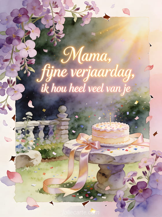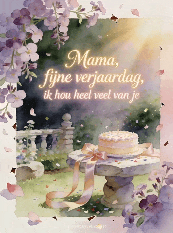 Vertel mama hoeveel je van haar houdt met zachtroze schrift, gouden gloed, watervallen van aubrietabloemen, een geglazuurde taart, satijnen linten en een feestelijke stenen tuinscène. Stuur ook een verjaardagsafbeelding voor mama, een fijne verjaardag mama geanimeerde gif of een tekst om fijne verjaardag tegen je mama te zeggen.