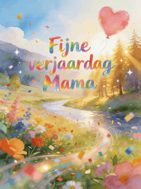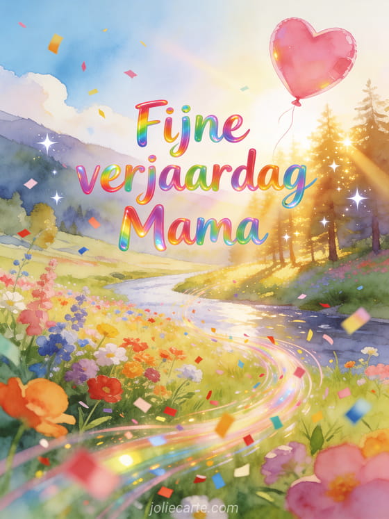 Stuur een vrolijke fijne verjaardag mama kaart met een bloemrijke vallei, confetti en een roze hartballon. Bekijk ook een gefeliciteerd mama verjaardagskaart of een virtuele verjaardagskaart mama.