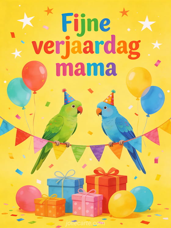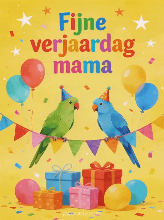 Wens mama een fijne verjaardag met een vrolijke tekening van twee kleurrijke papegaaien op een vlaggenlijn, omringd door cadeaus, ballonnen, sterren en een zonnige feestachtergrond. Je kunt ook een kort bericht voor verjaardag mama, een fijne verjaardag kaart voor mama of een kaart met fijne verjaardag mama hart sturen.