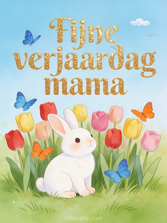 Verras je mama met een vrolijke verjaardagskaart vol tulpen en vlinders. Bekijk ook bericht om gefeliciteerd mama te wensen, bericht gefeliciteerd mama ontroerende tekst of gefeliciteerd mama.
