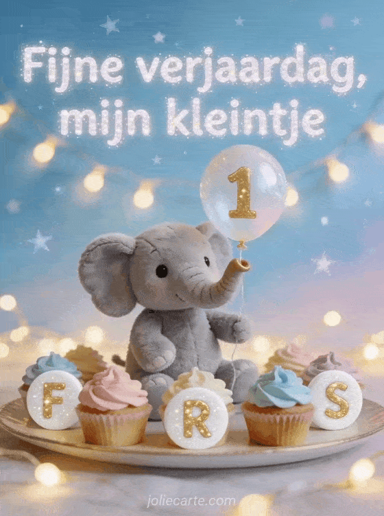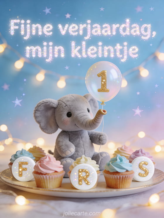 Vier de eerste verjaardag van je baby met een zachte magische illustratie van een grijze pluche olifant die een ballon met het cijfer 1 vasthoudt, cupcakes met kleurrijke room, warme lichtslingers en een pastelblauwe sterrenachtergrond. Ontdek ook tekst eerste verjaardag baby, fijne verjaardag mijn kleine baby of fijne verjaardag babydieren.