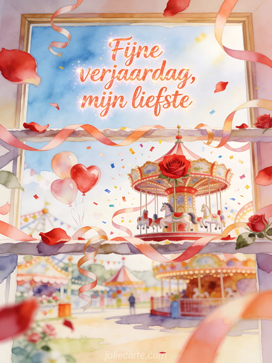 Wens je liefste een vrolijke verjaardag met een aquarelkaart met een rode rozencarrousel, hartballonnen, helder confetti en linten die over de lijst lopen. Personaliseer deze romantische groet online en stuur hem gratis in enkele momenten. Ontdek ook een geanimeerde fijne verjaardag mijn liefste gif, verjaardagsberichten voor mijn liefde of een geanimeerde fijne verjaardag kaart mijn liefde.