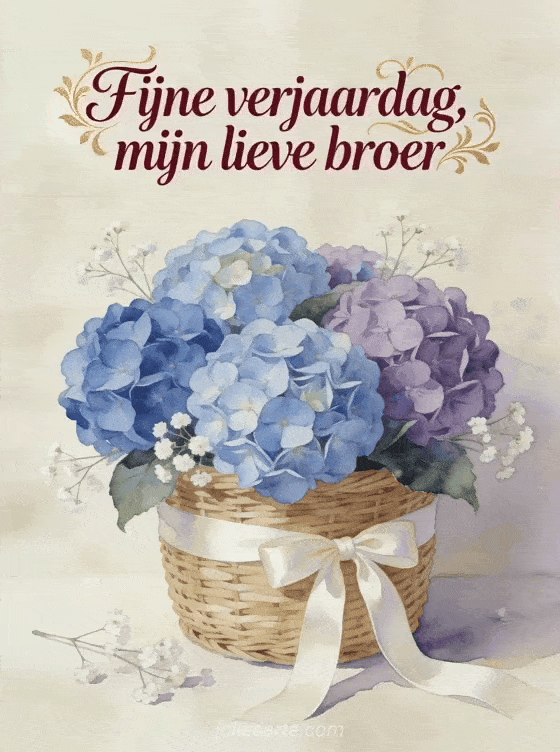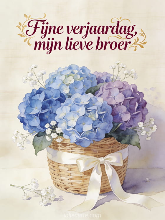 Stuur je lieve broer een verfijnde aquarelverjaardagskaart met blauwe en mauve hortensia's in een gevlochten mand, wit gipskruid en een ivoorkleurig satijnen lint. Je kunt ook een verjaardag broer gif, een verjaardagscitaat broer of een mijn broer fijne verjaardag broer humor kaart delen.