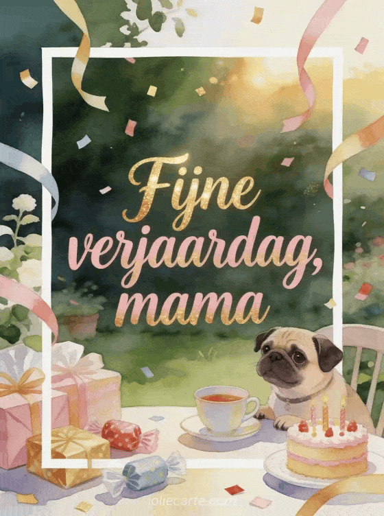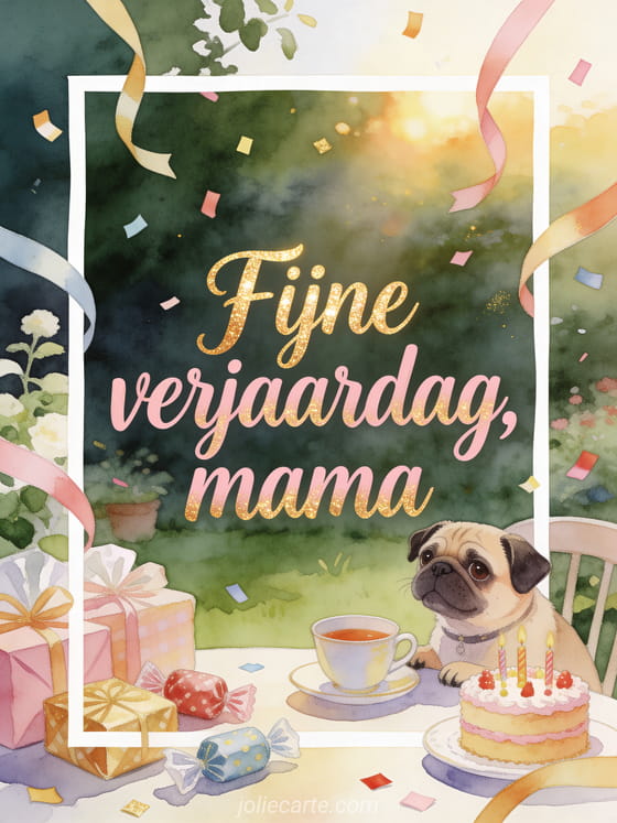 Deel een afbeelding voor fijne verjaardag mijn lieve mama met een pug naast een kopje, ingepakte snoepjes en een kleine verjaardagstaart op een gezellige tuintafel. Kies ook voor fijne verjaardag mama bericht, fijne verjaardag mama ik hou van je of gratis verjaardagskaart mama.