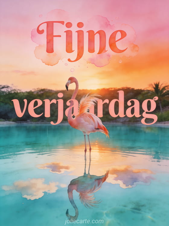 Deel een elegante fotorealistische verjaardagskaart met een roze flamingo in een turquoise lagune bij zonsondergang, met zijn spiegeling glanzend in het water. Bekijk ook een bericht fijne verjaardag zoon, een fijne verjaardag fijne verjaardag mijn zoon of een sms om mijn zoon fijne verjaardag te wensen.