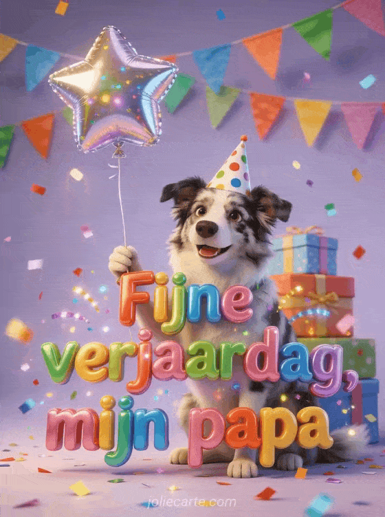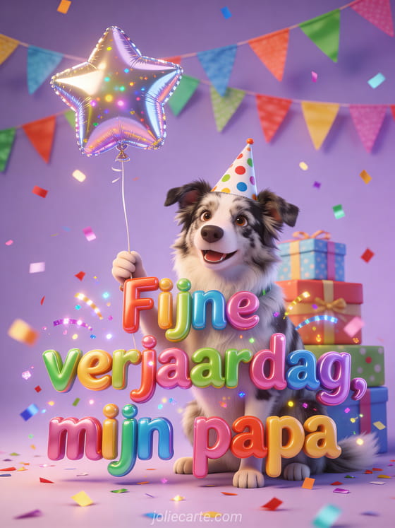 Vier papa met een vrolijke 3D-stijl illustratie van een Australische herder met een feesthoed met stippen, die een stervormige ballon vasthoudt, met gestapelde cadeaus, kleurrijke vlaggetjes, veelkleurige confetti en een heldere lavendelachtergrond. Ontdek ook fijne verjaardag papa liefde, gedicht gefeliciteerd met je verjaardag schoonvader of gedicht fijne verjaardag lieve papa.