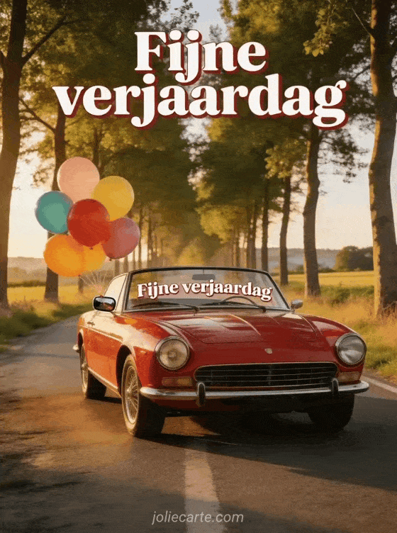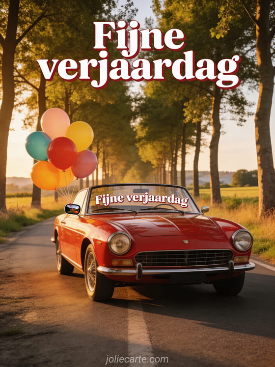 Stuur een nostalgische elegante verjaardagsgroet met een prachtige rode cabriolet oldtimer geparkeerd op een landweg omzoomd door platanen. Kleurrijke ballonnen aan de spiegel in golden hour licht. Bekijk ook fijne verjaardag afbeelding gratis of fijne verjaardag bloemen.