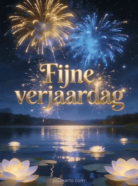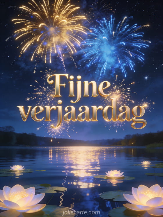 Stuur een fijne verjaardag papa kaart met majestueuze gouden tekst, vuurwerk boven een sterrenrijk nachtelijk meer, lichtreflecties en stralende waterlelies. Ontdek ook een verjaardagstekst voor zijn papa, een grappig fijne verjaardag papa komisch of een kindertekening verjaardag papa.