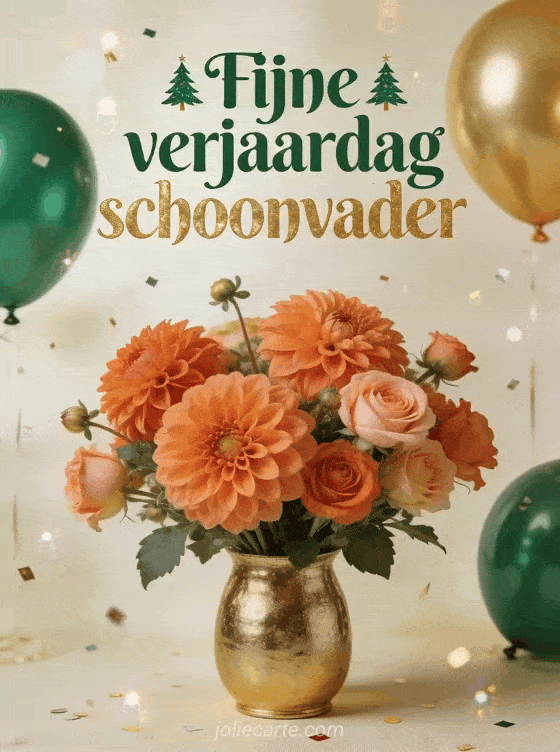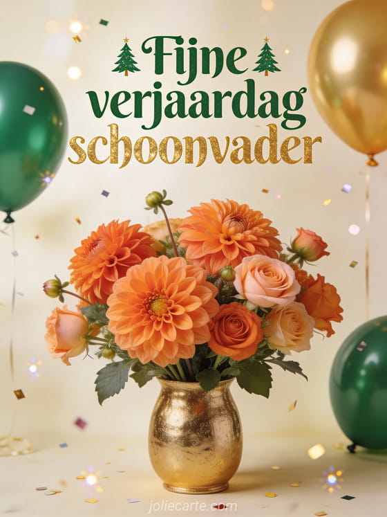 Vier de verjaardag van je schoonvader met een elegante kaart vol dahlia's, ballonnen en feestelijke details. Bekijk ook verjaardag papa sms, fijne verjaardag papa afbeelding of fijne verjaardag mijn papa.