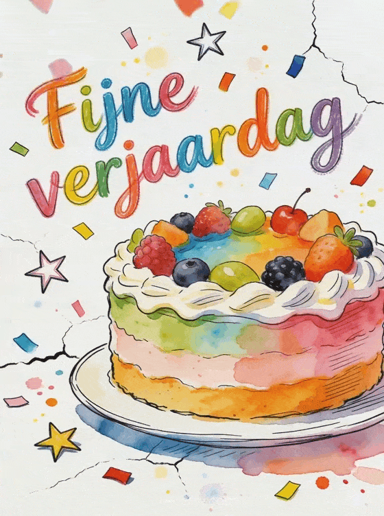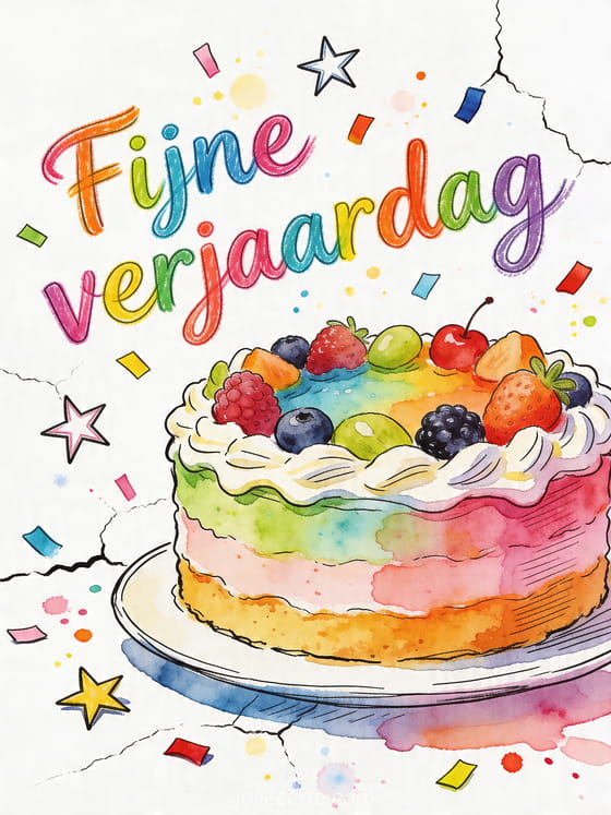 Breng kleur in een speciale dag met deze vrolijke verjaardagskaart en haar artistieke taartillustratie. Bekijk ook fijne verjaardag prinses, formule om fijne verjaardag te wensen of paradijselijk fijne verjaardag strand.