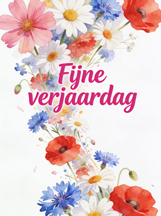 Vier met een levendige verjaardagskaart waarop kosmos, margrieten en klaprozen als een feestelijke bloemenwaterval naar beneden vallen. Bekijk ook verjaardagskaart vrouw champagne, foto's gefeliciteerd vrouw en verjaardag vrouw gratis.