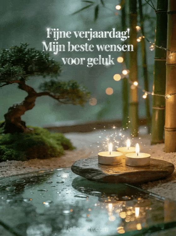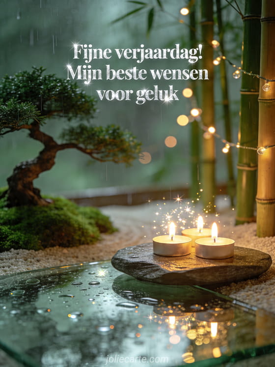 Deel rustige verjaardagswensen met deze ontspannende kaart met een zentuin, bonsai, gloeiende kaarsen en warme lichtjes tussen het bamboe. Ontdek ook bloem fijne verjaardag, bloemenboeket fijne verjaardag en gefeliciteerd met je verjaardag wensen op afstand.