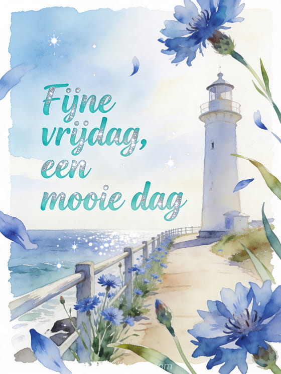 Deel een lichtgevende vrijdaggroet met turquoise letters, een pad aan zee, een witte vuurtoren, blauwe korenbloemen en sprankelend water. Ontdek ook fijne vrijdag kusjes afbeeldingen, een vrijdag kusjes gif of een koude fijne vrijdag gif.