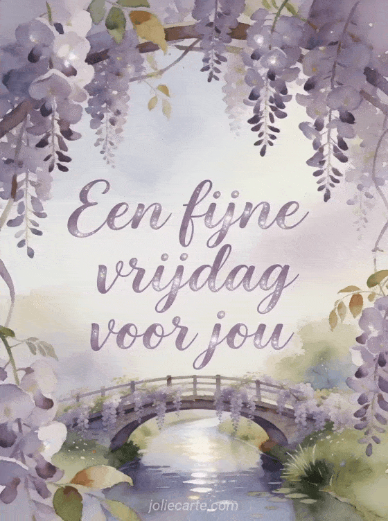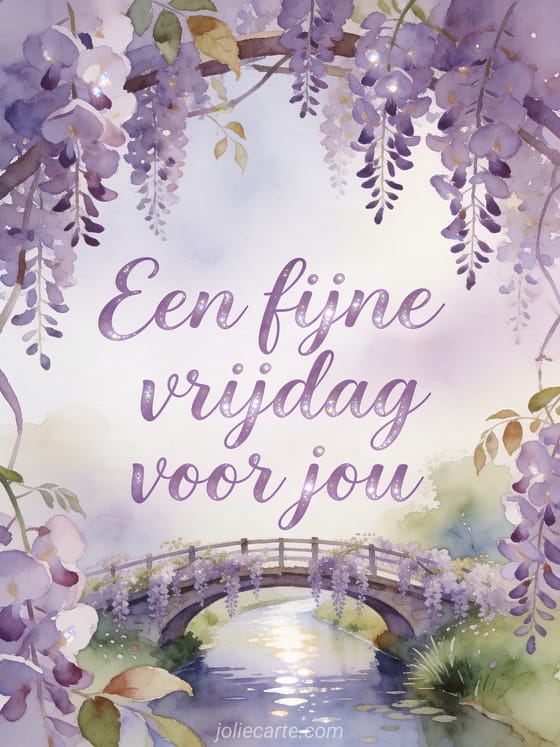 Deel een serene fijne vrijdag met elegante lavendelkleurige letters en parelmoerglans. Deze gratis kaart toont een boogbrug over een smalle rivier onder hangende blauwe regen, met vallende bloesems en lichtende weerspiegelingen. Bekijk ook fijne vrijdag en fijn weekend afbeeldingen, een goedemorgen vrijdag gif of een fijne vrijdag tekst.