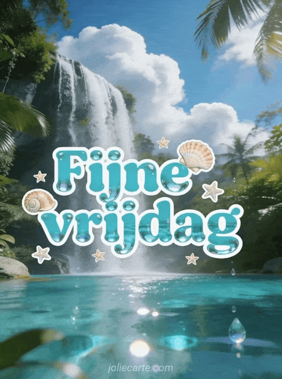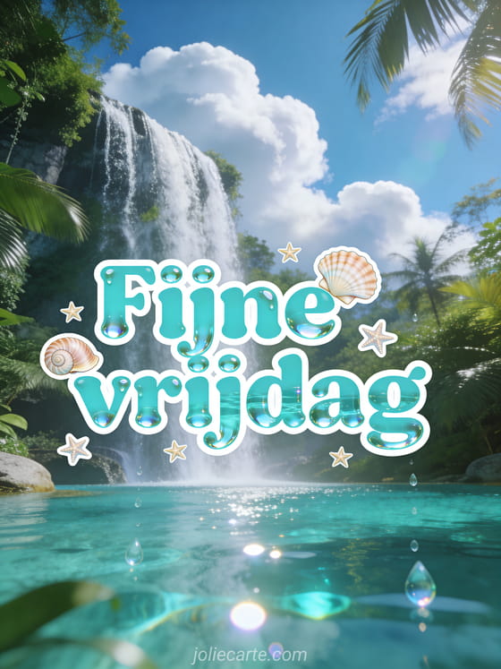 Deel een weelderige kaart voor fijne vrijdag met ronde turquoise letters, waterreflecties, schelpen, kleine zeesterren, een majestueuze waterval die in een smaragdgroen natuurlijk bad valt, een heldere blauwe lucht, witte wolken en tropisch groen. Bekijk ook fijne vrijdag fijn weekend humor, bericht om moslims een fijne vrijdag te wensen of fijne vrijdag koffie afbeelding.