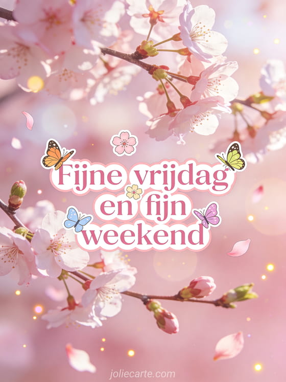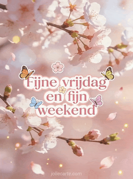 Deel een vrolijke vrijdag- en weekendgroet met kersenbloesemtakken, kleurrijke vlinders, zachte roze bloemblaadjes en helder lentelicht. Je kunt ook goedemorgen vrijdag humor gif of fijne vrijdag landschap gif sturen.