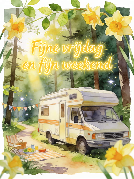 Verwelkom het weekend met een retro camper in aquarel bij een zonnig bospad, picknickwimpels, narcissen en frisse groene bladeren. Ontdek ook goedemorgen vrijdag gif, fijne vrijdag tekst of fijne vrijdag afbeelding op fb.