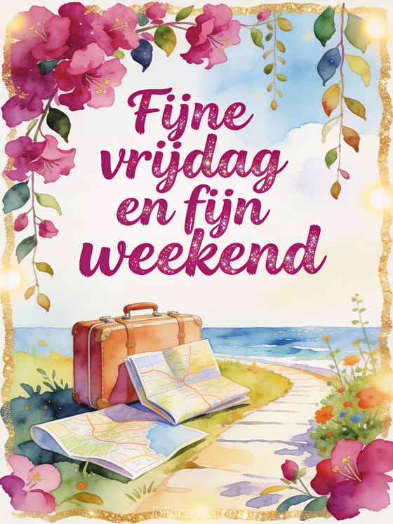 Deel wensen voor fijne vrijdag en fijn weekend met een vrolijke aquarelscene van fuchsia bloemen, een kleine reiskoffer, een gevouwen wegenkaart en een helder pad langs zee. Je kunt ook een fijne vrijdag in de regen gif, vrijdag kusjes afbeeldingen of een heel fijne vrijdag afbeelding sturen.
