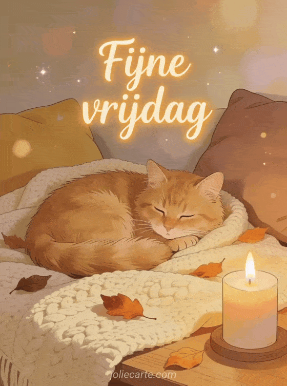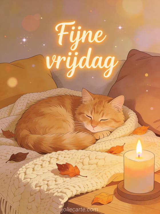 Deel een warme fijne vrijdag en fijn weekendgroet met een pluizige rode kat op een gebreide deken, herfstbladeren, kaarslicht en kussens. Ontdek ook een fijne vrijdag kusjes afbeelding, een fijne vrijdag kaart of een grappige fijne vrijdag humor gif.