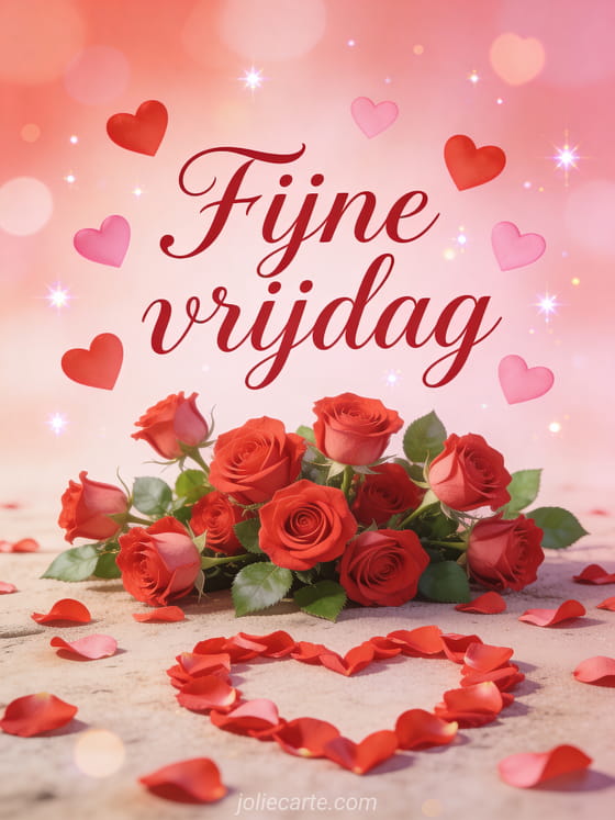 Stuur een romantische fijne vrijdag groet met zachte rode en roze harten, elegante letters en rode rozen waarvan de verspreide bloemblaadjes een hart vormen. Ontdek ook een goedemorgenkaart voor een mooie vrijdag, een grappige goedemorgen vrijdag kaart of een vrijdag kusjes kaart.