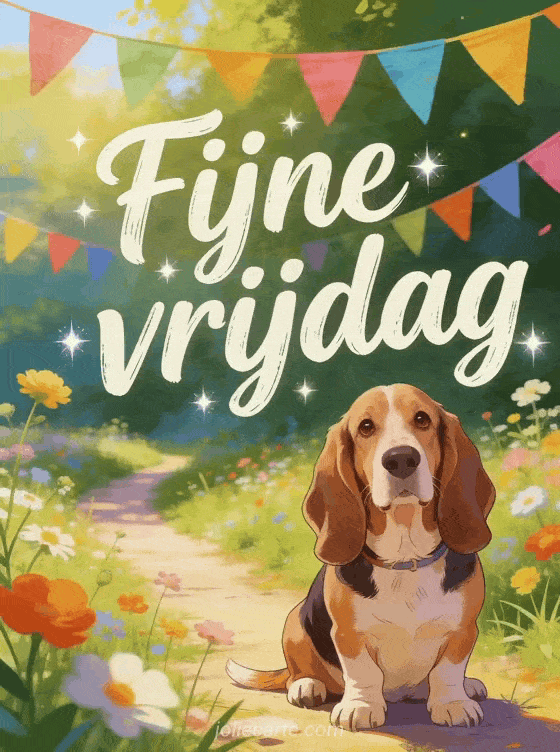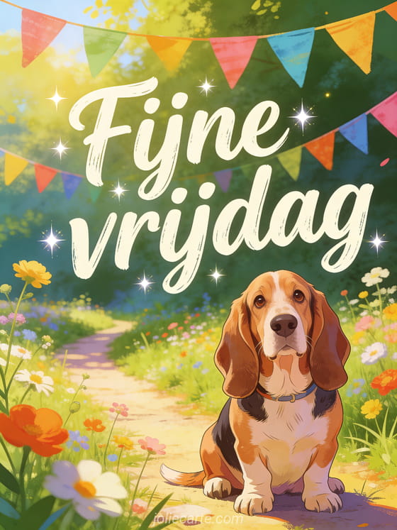 Deel fijne vrijdag met romige penseelletters, een basset hound-hond op een zonnig weidepad, kleurrijke vlaggetjes en veldbloemen. Stuur ook hou vol het is vrijdag, een fijne vrijdag en fijn weekend afbeelding of bericht fijne vrijdag.