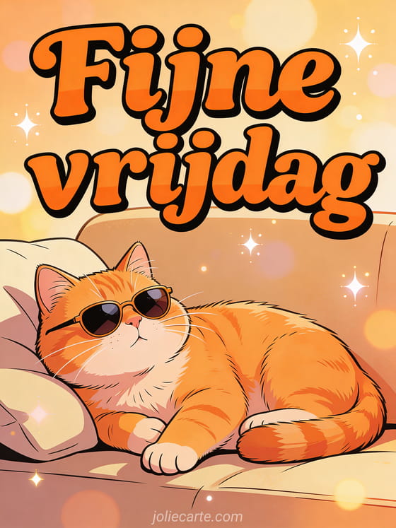 Deel een hilarische fijne vrijdag humor kaart met een mollige oranje kat in een klein zonnebrilletje. De perfecte manier om het weekend te verwelkomen. Ontdek ook een kaart goedemorgen fijne vrijdag of een kaart vrijdag fijne dag.