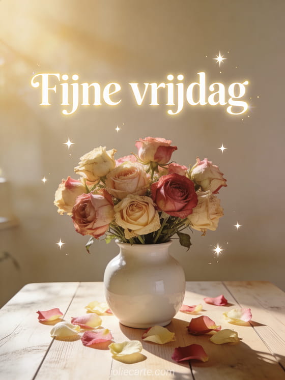 Stuur een delicate fijne vrijdag met een boeket oude rozen in een witte keramische vaas, zacht ochtendlicht en verfijnde sprankelende details. Ontdek ook grappige fijne vrijdag humor gif, fijne vrijdag kusjes geanimeerde gifs of een vrijdag goedemorgen citaat.