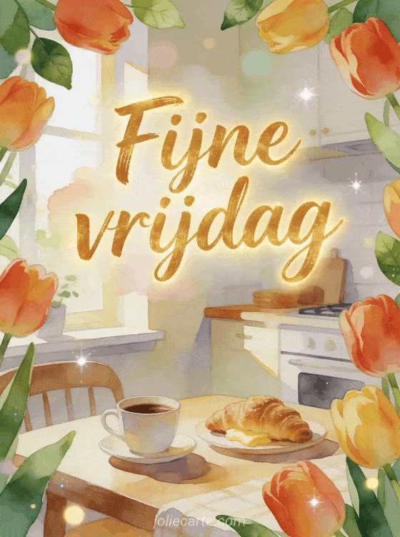 Stuur een vrolijke fijne vrijdag groet met heldere tulpen, frisse bladeren, een koffiekop en boterige croissants op een gezellige ochtendtafel in een zonnige keuken. Ontdek ook tekst om een fijne vrijdag te wensen, een fijne vrijdag vlinder afbeelding of fijne vrijdag geanimeerde afbeeldingen.