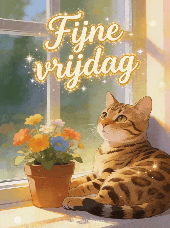 Deel een fijne vrijdag kat afbeelding met romige letters, vrolijke schittering en een Bengaalse kat bij een zonnig raam naast een kleine bloempot. Stuur ook hou vol het is vrijdag, een fijne vrijdag en fijn weekend afbeelding of een goedemorgen vrijdag humor gif.