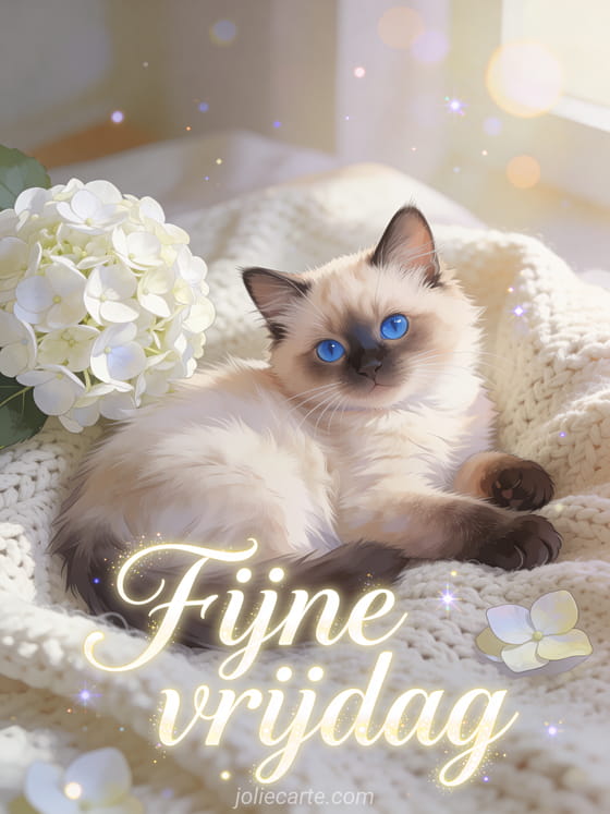 Deel een zachte fijne vrijdag groet met elegante crèmekleurige glansletters, een pluizige Siamese kitten met blauwe ogen op een gezellige gebreide deken en witte hortensia's dichtbij. Ontdek ook goedemorgen vrijdag afbeeldingen, een kaart voor fijne vrijdag Kerst of virtuele kaarten voor fijne vrijdag.