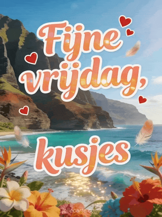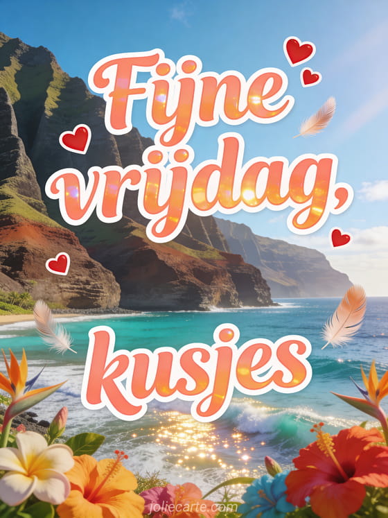 Verstuur een fijne vrijdag kusjes afbeelding met zachte koraalletters, kleine rode hartjes, lichte veren en de spectaculaire Na Pali Coast in gouden winterzon. Deel een tedere wens voor het einde van de week en ontdek ook fijne vrijdag kaart, grappige fijne vrijdag humor gif of fijne vrijdag kusjes geanimeerde gifs.