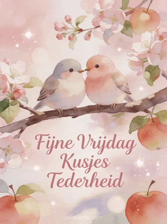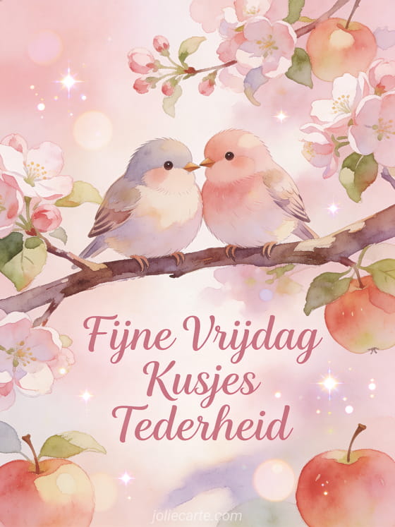 Deel een tedere vrijdaggroet met verliefde vogels op een bloeiende appelboom in de lente. Ontdek ook een fijne vrijdag natuur kaart of een afbeelding fijne vrijdag kaart.