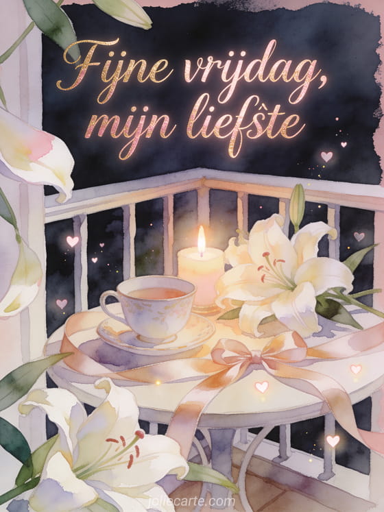 Stuur fijne vrijdag, mijn liefste met roségouden letters, een romantische balkontafel, een porseleinen theekopje, roomkleurige lelies, satijnen lint en kleine hartlichtjes. Ontdek ook fijne vrijdag kat afbeelding, fijne vrijdag allemaal afbeelding of geanimeerde afbeeldingen fijne vrijdag.