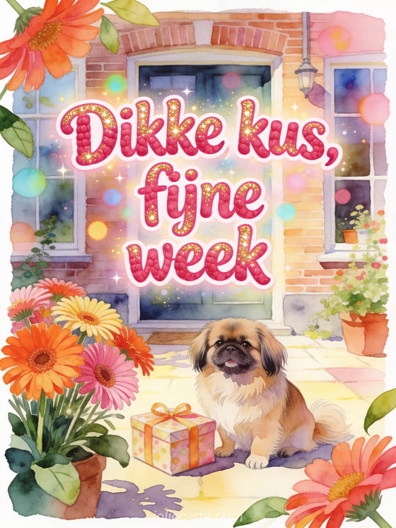 Deel een vrolijke wens voor een fijne week met frambooskleurige letters, een Pekinees hond, een ingepakt cadeau en heldere gerbera's op een zonnige binnenplaats. Ontdek ook kusjes voor de hele week, fijne week kaart kusjes of hart kusjes van de week.