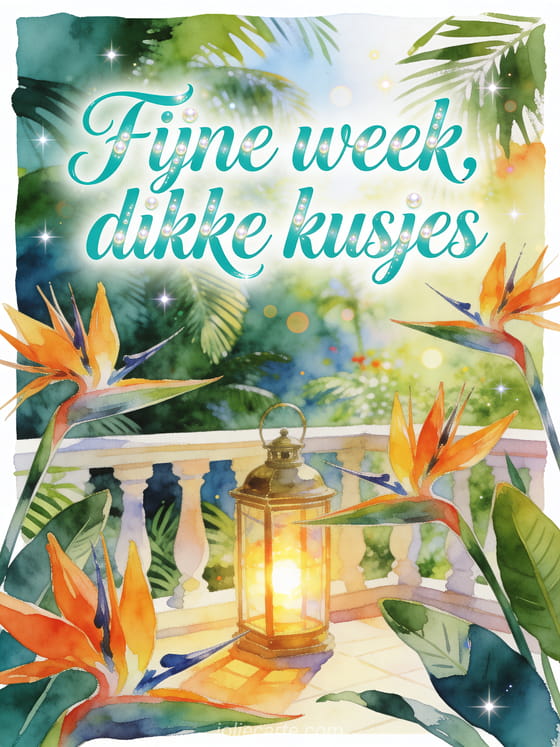 Stuur een heldere groet voor een fijne week met strelitzia, een messing lantaarn in warm licht en elegante turquoise aquarelletters. Ontdek ook een mooie week kusjes, een fijne week en dikke kusjes of een fijne week motivatie.