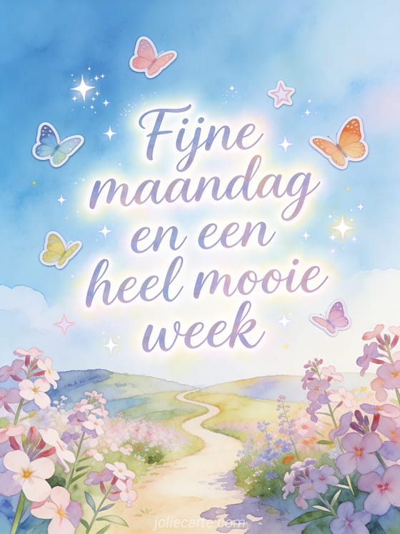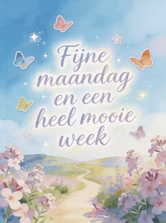 Stuur fijne maandag en een heel mooie week met kleurrijke vlinders, fonkelende sterren en een slingerend pad door bloeiende phlox onder een frisse blauwe lucht. Bekijk ook fijne maandag en fijne week citaat gif, afbeeldingen om een fijne maandag te wensen of fijne maandag landschap gif.
