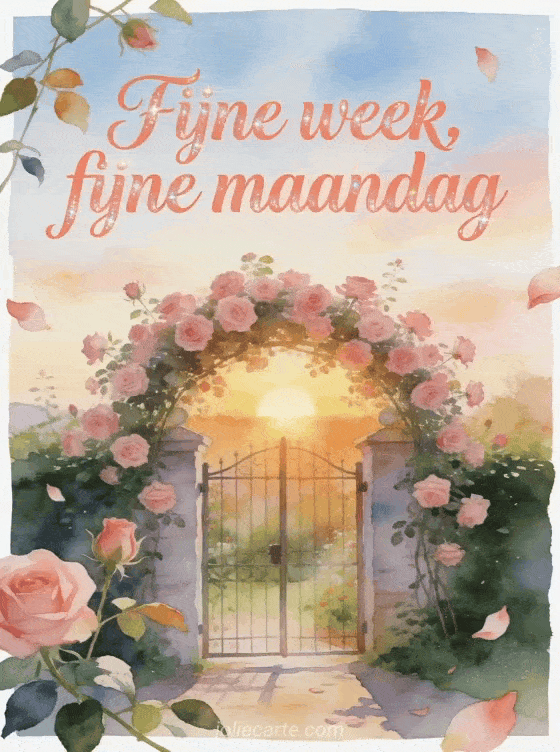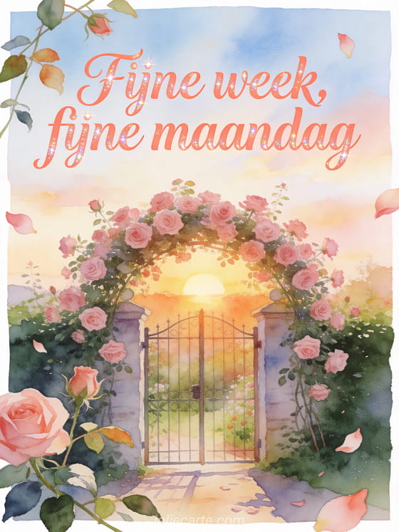 Stuur een bemoedigende fijne week en fijne maandag groet met zonsopgang boven een kleine tuinpoort vol roze rozen, bloemblaadjes en bladstelen. Ontdek ook goedemorgen maandag goedemorgen afbeelding, een fijne maandag geanimeerde afbeelding of een fijne maandag succes afbeelding.